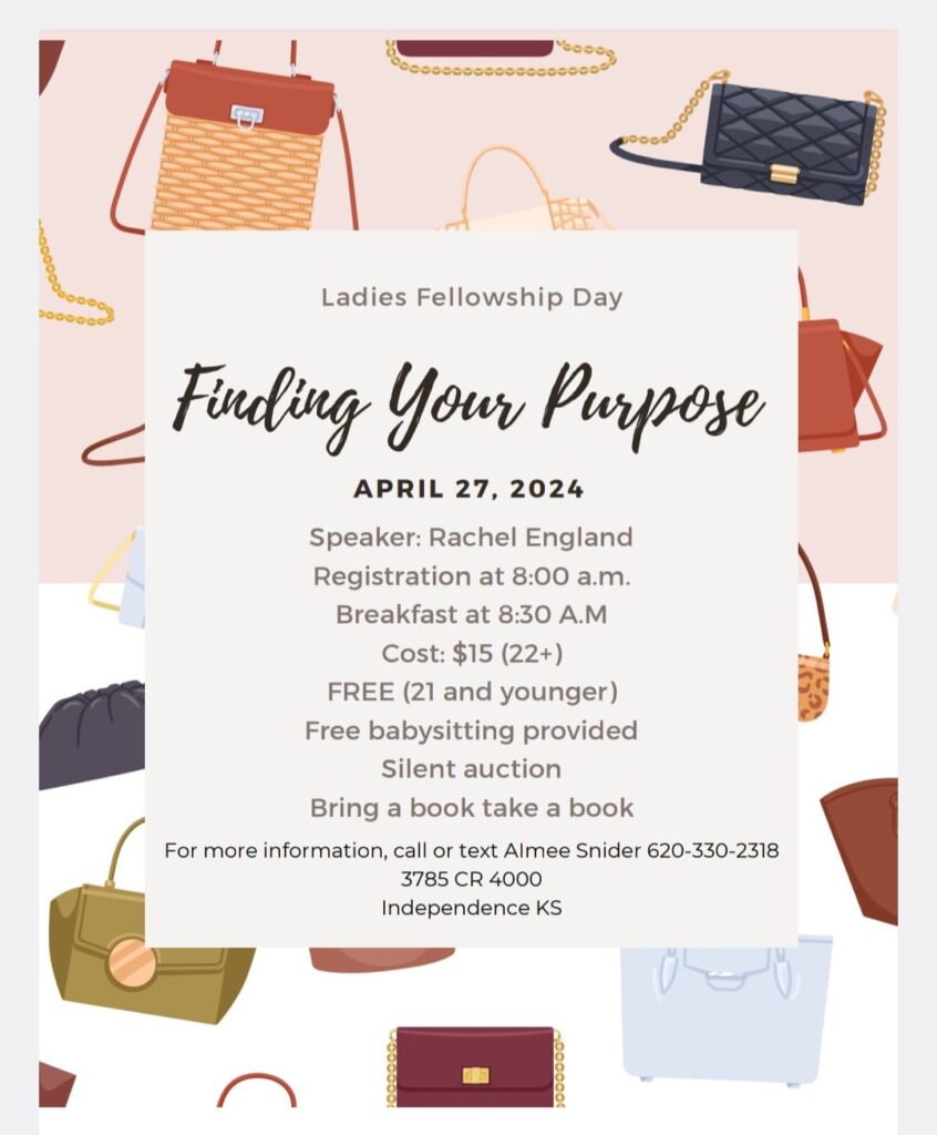 All Ladies are invited to this year’s Ladies Fellowship Day on April 27th in Independence, KS. The registration for the event starts at 8 AM with Breakfast at 8:30 AM.